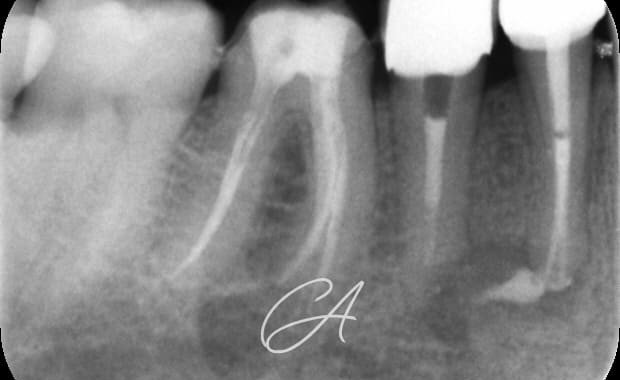 Il controllo dei tessuti gengivali è ancora precoce ma la guarigione radiografica periapicale è a 1 anno (ultima radiografia visibile).